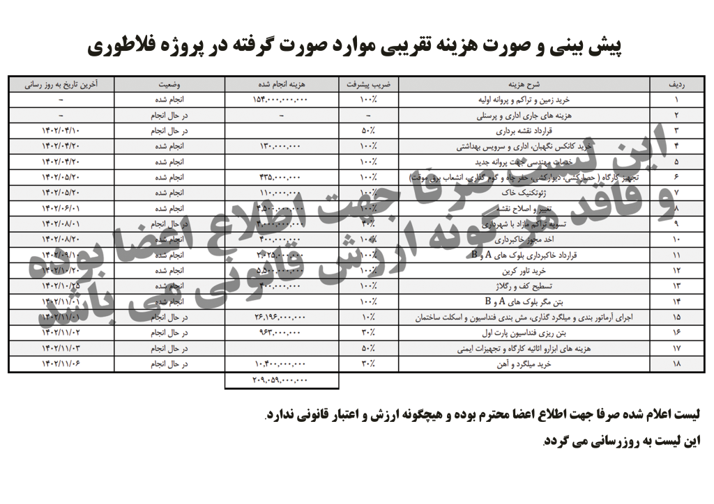 - از اعضای پروژه انتظار میرود با پرداختهای منظم طبق جدول اعلام شده به اجرای هرچه سریعتر و بهتر پروژه کمک کنند.{ تاریخ آگهی 1403/08/21}